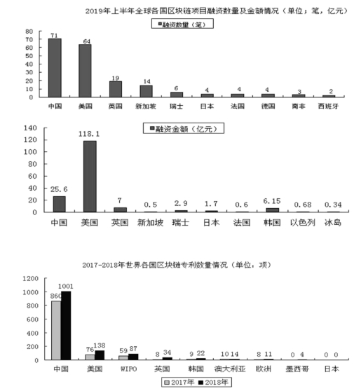 C项,“2019年,中美区块链融资市场相对活跃,中国融资数量和金额均高于美国”错误。从材料二图表中看,中国融资数量比美国少。